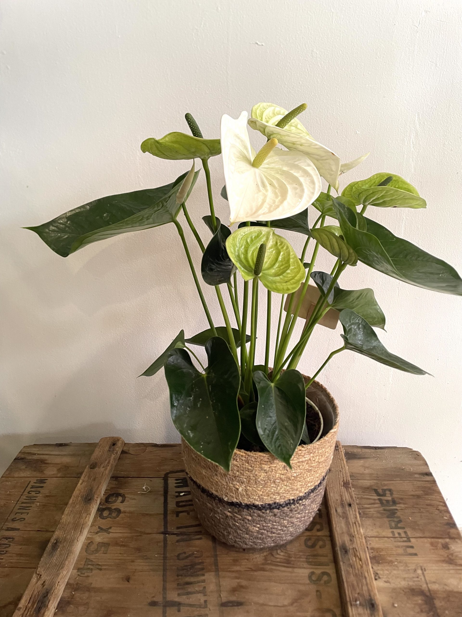 Avec ses grandes fleurs blanches brillantes en forme de coeur et son feuillage vert intense, l’anthurium blanc est une plante décorative intemporelle. Symbole de pureté et d’élégance, il s’intègre aussi bien dans un intérieur moderne que plus classique.