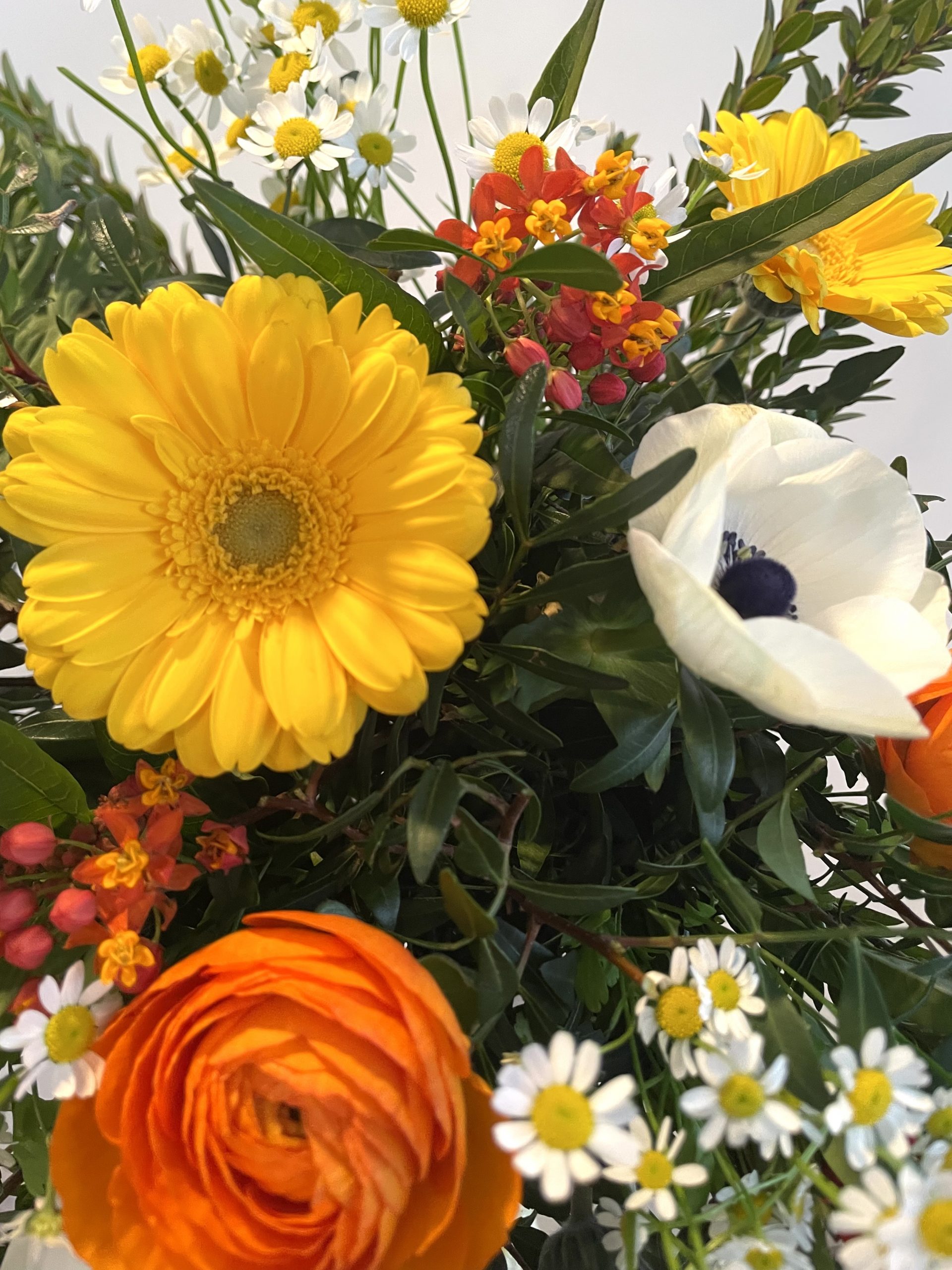 Le Temps des fleurs est un bouquet champêtre aux teintes lumineuses de jaune et d’orange, imaginé comme un rayon de soleil à offrir. Composé de fleurs de saison soigneusement sélectionnées, il mêle la délicatesse des renoncules, l’élégance des anémones, et la fraicheur des germinis pour créer une harmonie douce, naturelle et pleine de tendresse.