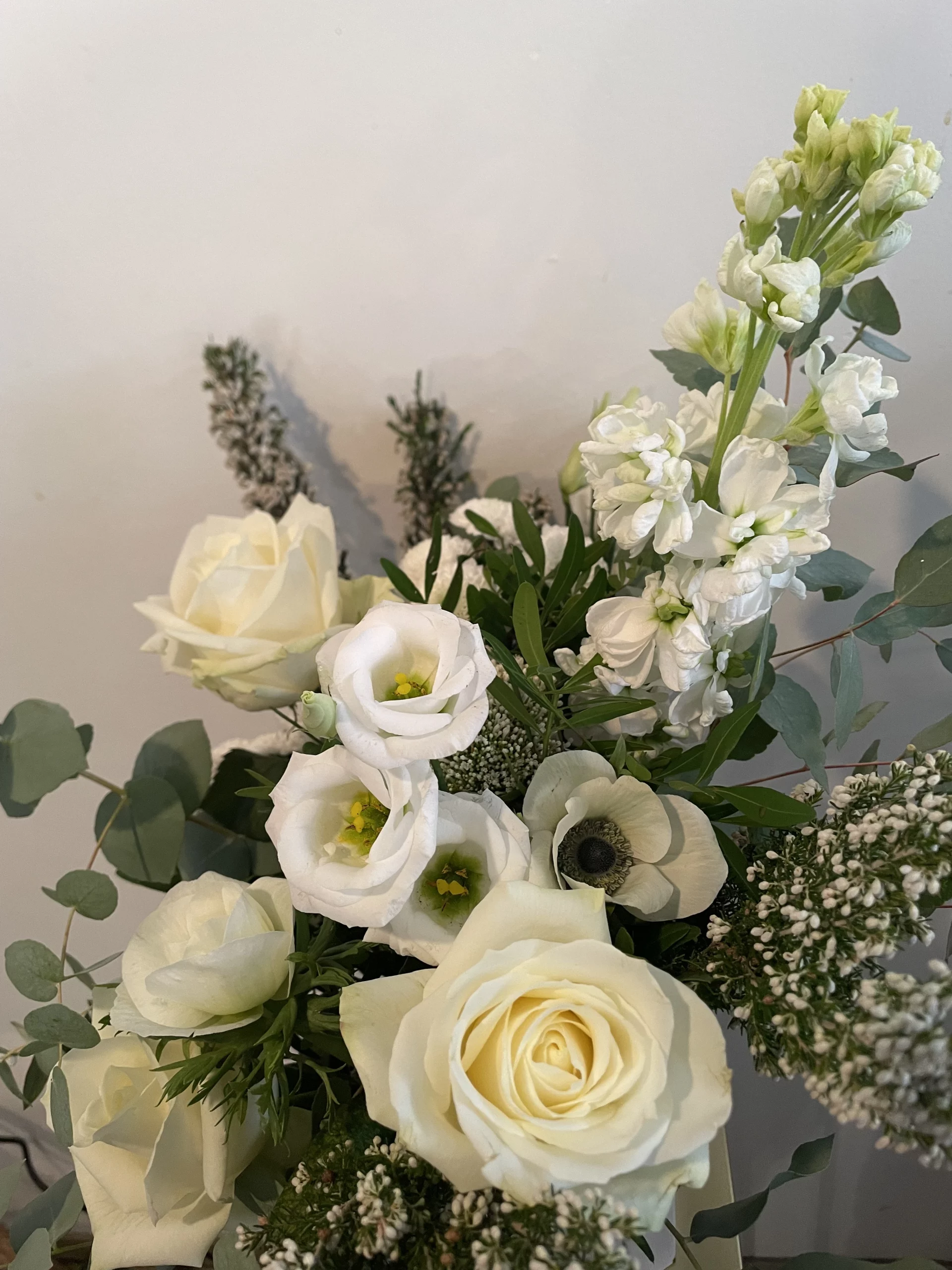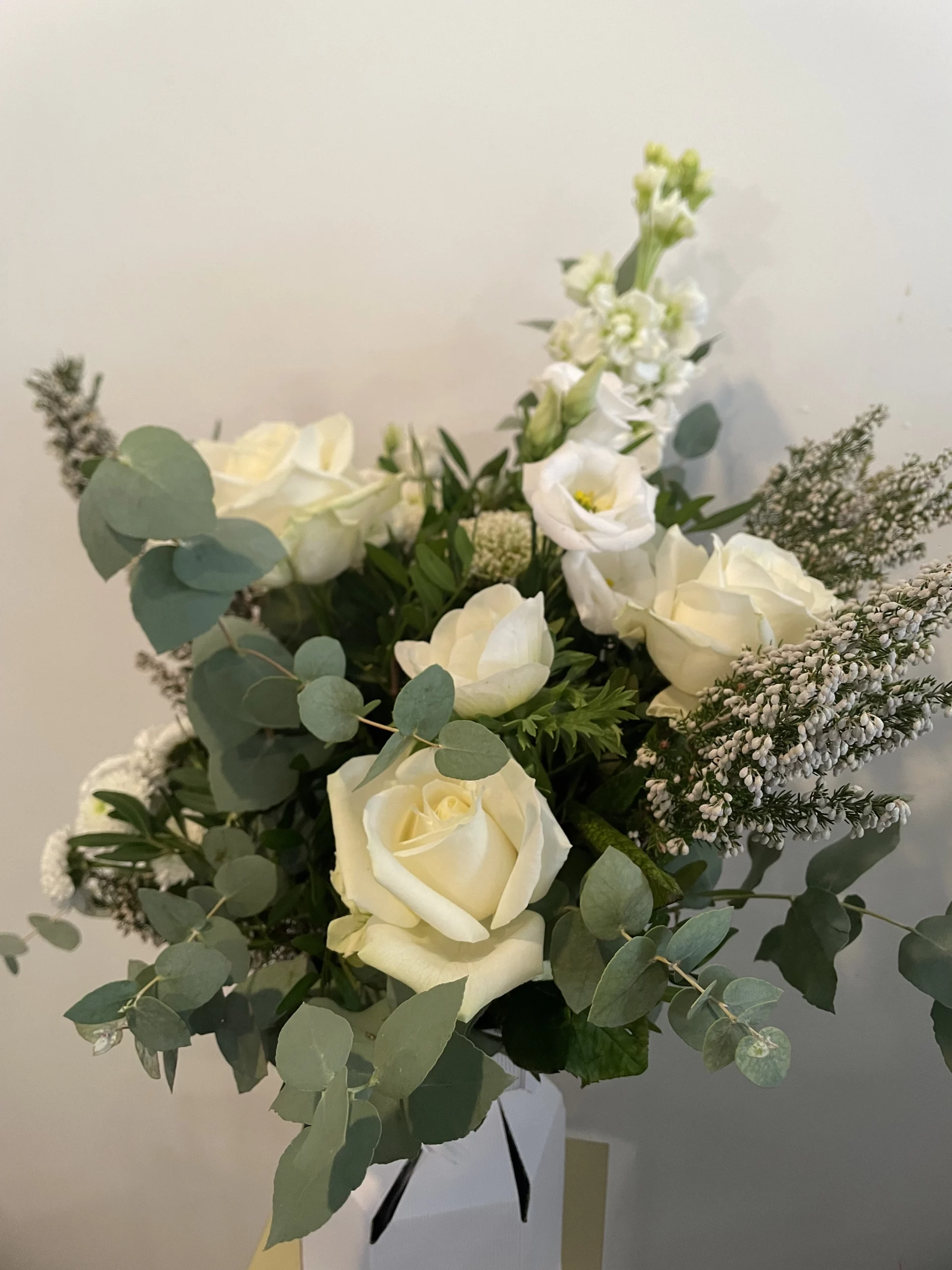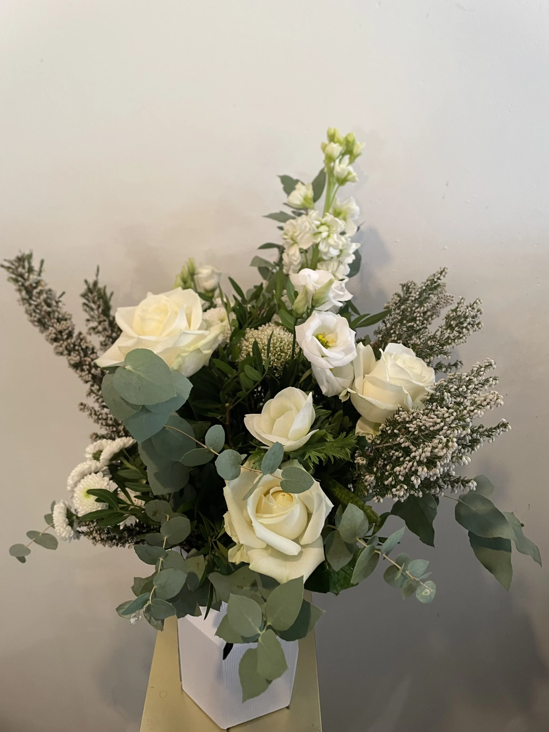 Un bouquet blanc, élégant et apaisant, composé de roses blanches et de fleurs de saison, sublimées par un joli feuillage.